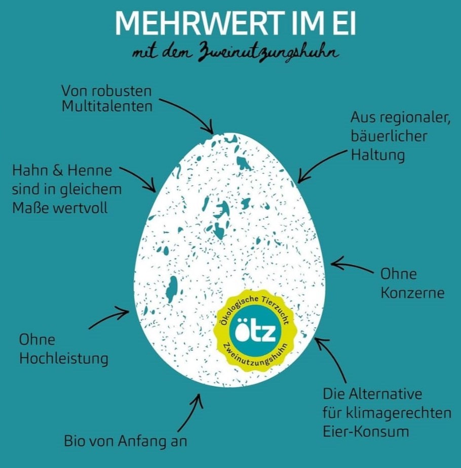 Und beim Eierkauf bitte immer bedenken: 50% der Küken, die schlüpfen sind männlich. Somit gibt es zu jeder Legehenne immer auch noch einen Bruder für den wir als Eierkonsumenten Verantwortung tragen. Mehr Infos gibt es auf www.oekotierzucht.de !